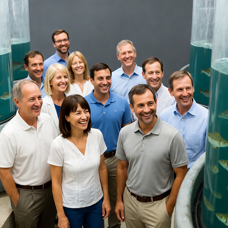 A diverse group of smiling professionals stands together in a modern office flanked by tall cylindrical fish tanks filled with fish. The men wear collared shirts and pants, while the women wear blouses and pants. They pose happily between the glass aquariums on a gray background.