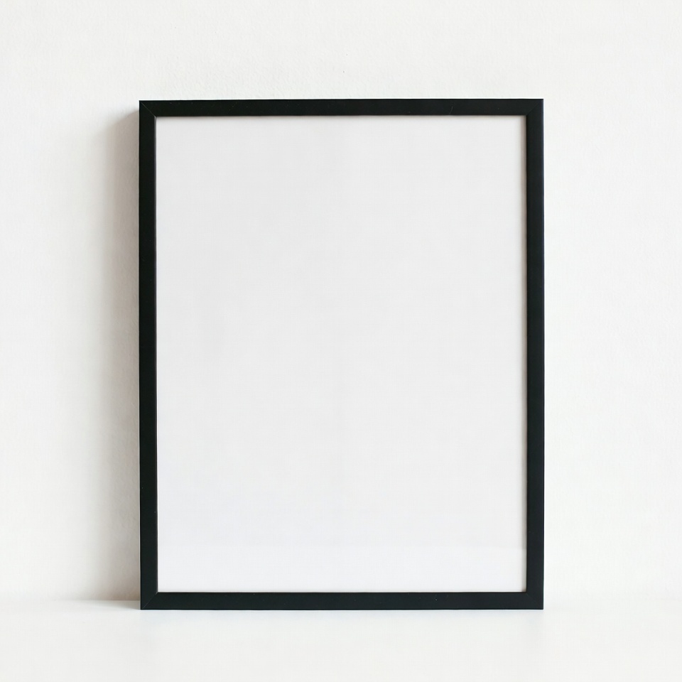 A black picture frame with a blank white poster inside sits on a white surface. The frame has a thin black border surrounding the empty white space. It is photographed against a plain white background.