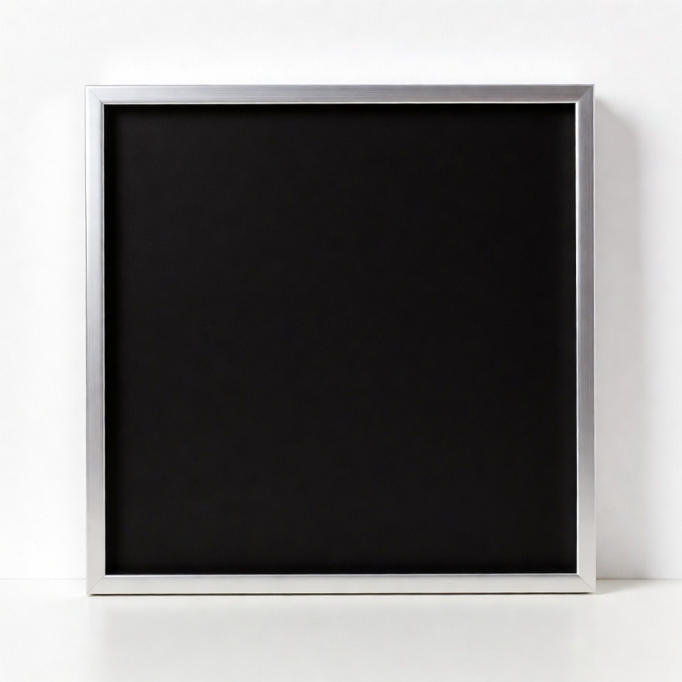 A square black chalkboard is mounted in a thin silver frame. The chalkboard surface is completely blank and smooth. The framed chalkboard is centered against a plain white background.