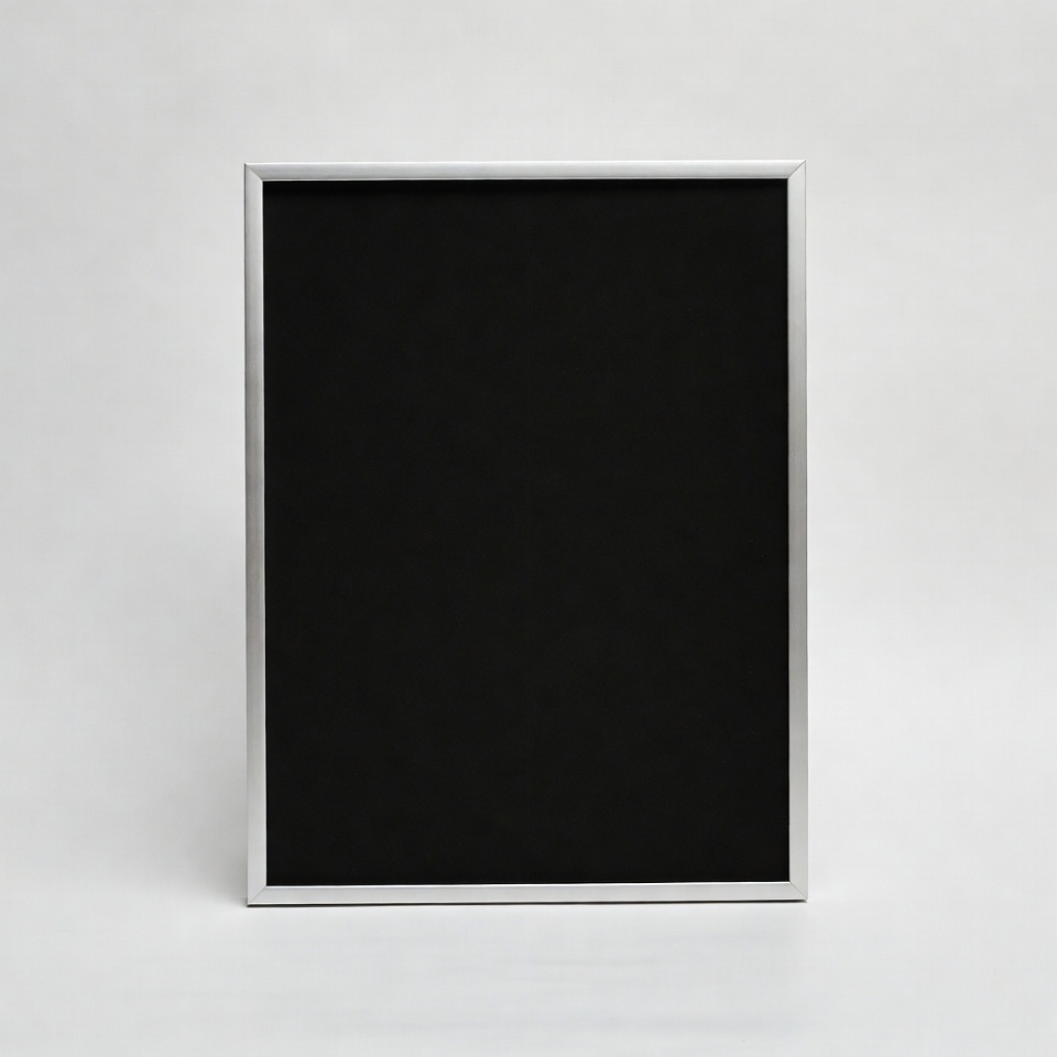 A rectangular black chalkboard is mounted in a thin silver frame. The board surface is completely blank and smooth. It is centered against a plain white background.