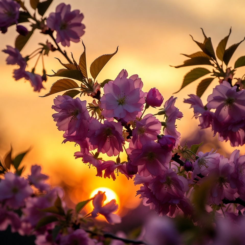 bloom, blossom cluster, bokeh, branches, cherry tree, dusk, floral, foliage, garden, golden hour, green leaves, macro flower, nature, orange sun, outdoor, petals, pink flowers, plant, sakura, seasonal bloom, spring flowers, sunset, tree blossoms, vibrant colors, cherry blossoms