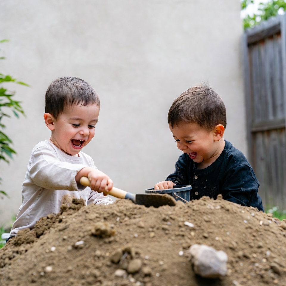 Two young boys with short brown hair laugh joyfully while playing in a large pile of dirt outdoors. One boy in a light-colored long-sleeve shirt digs with a wooden-handled shovel, while the other in a black shirt holds a gray bucket. They are positioned in front of a wooden fence with green plants nearby.