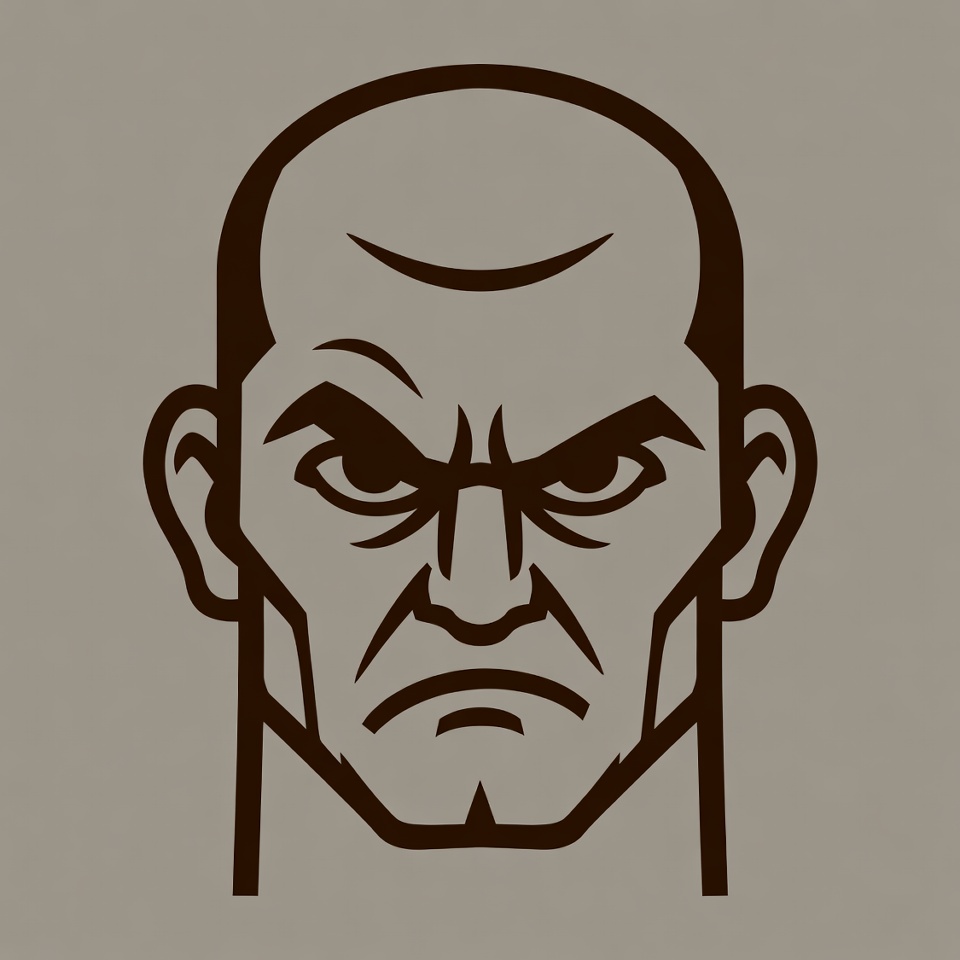 A bold black line art illustration of a bald man's face with a fierce, angry expression. He has thick eyebrows furrowed, narrowed eyes glaring intensely, and a downturned mouth on a light gray background. The style is simple vector graphic with strong outlines.
