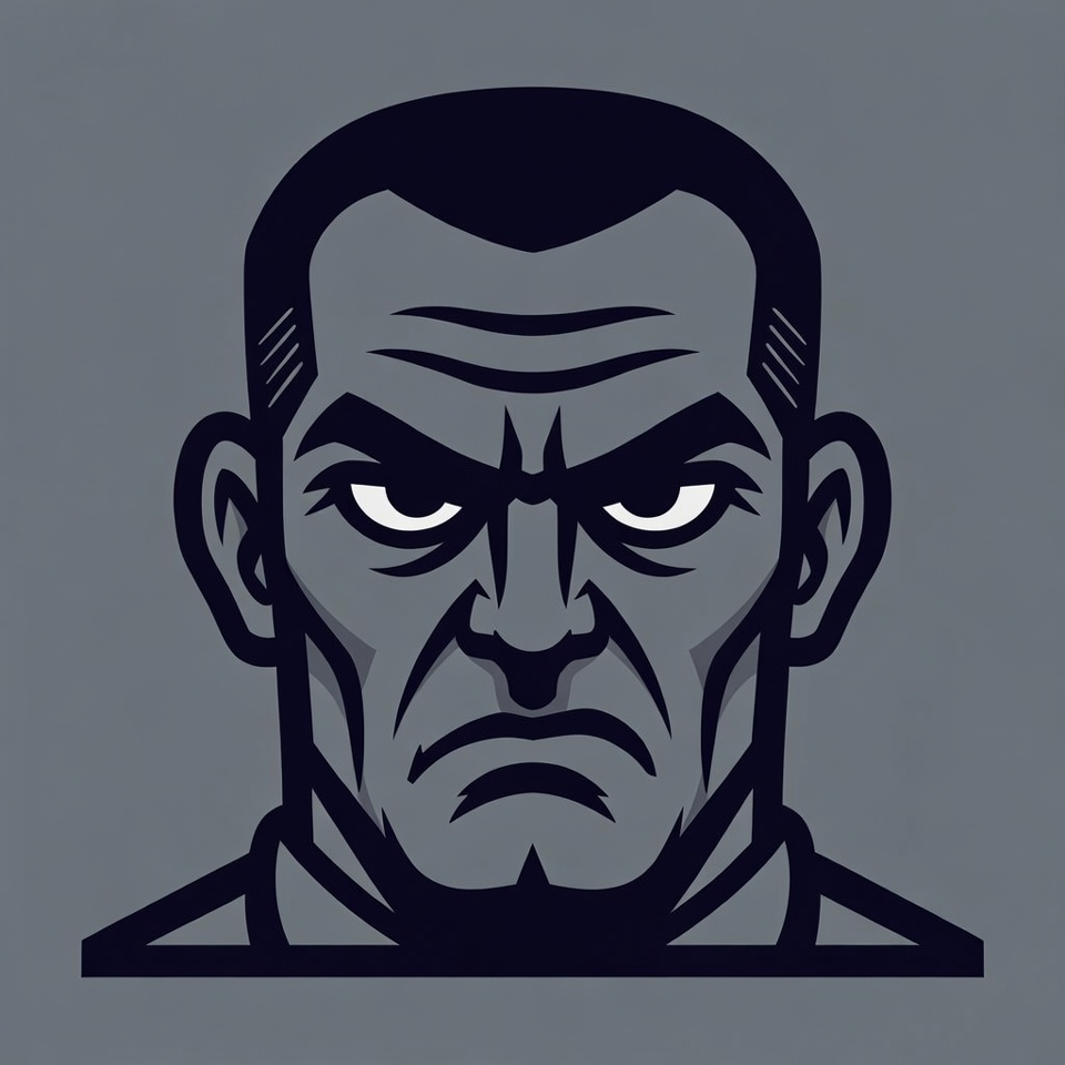 A bold black and gray vector illustration depicts a stern man's face with furrowed brows and a frowning mouth. He wears a collared shirt visible at the neckline. The design features thick outlines on a solid gray background.