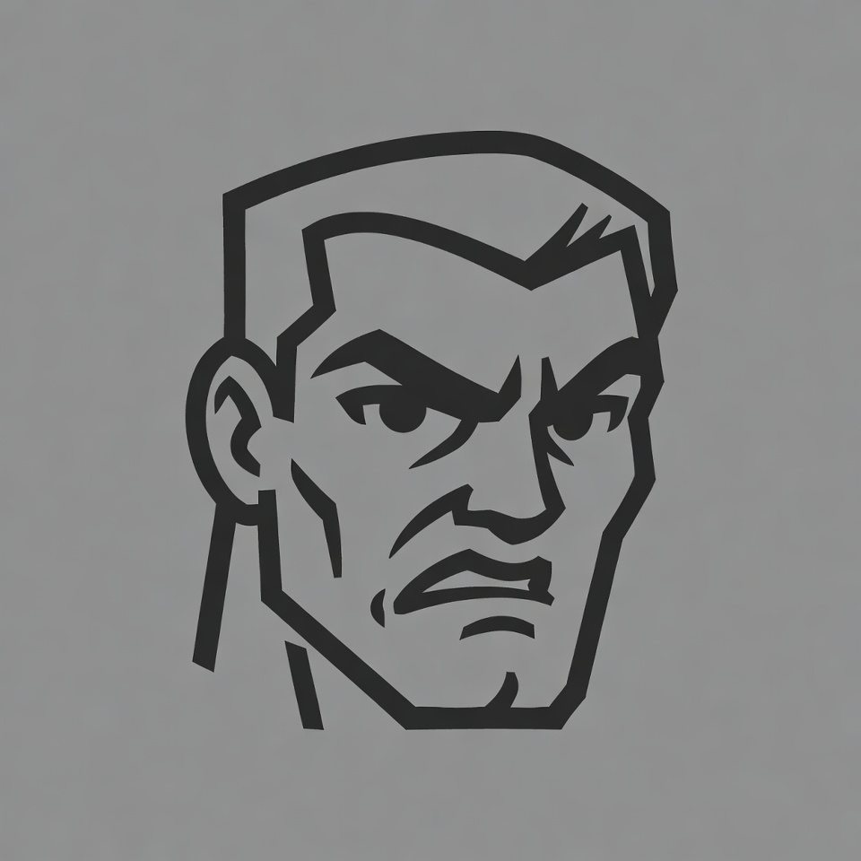 White, aggressive man, angry man, angular face, black outline, bold lines, cartoon illustration, cartoon man, clipart, comic style, fierce expression, furrowed brows, glaring eyes, graphic design, gray background, head profile, illustration, line art, male, menacing look, snarling mouth, stencil, stylized portrait, tough guy, vector, angry face