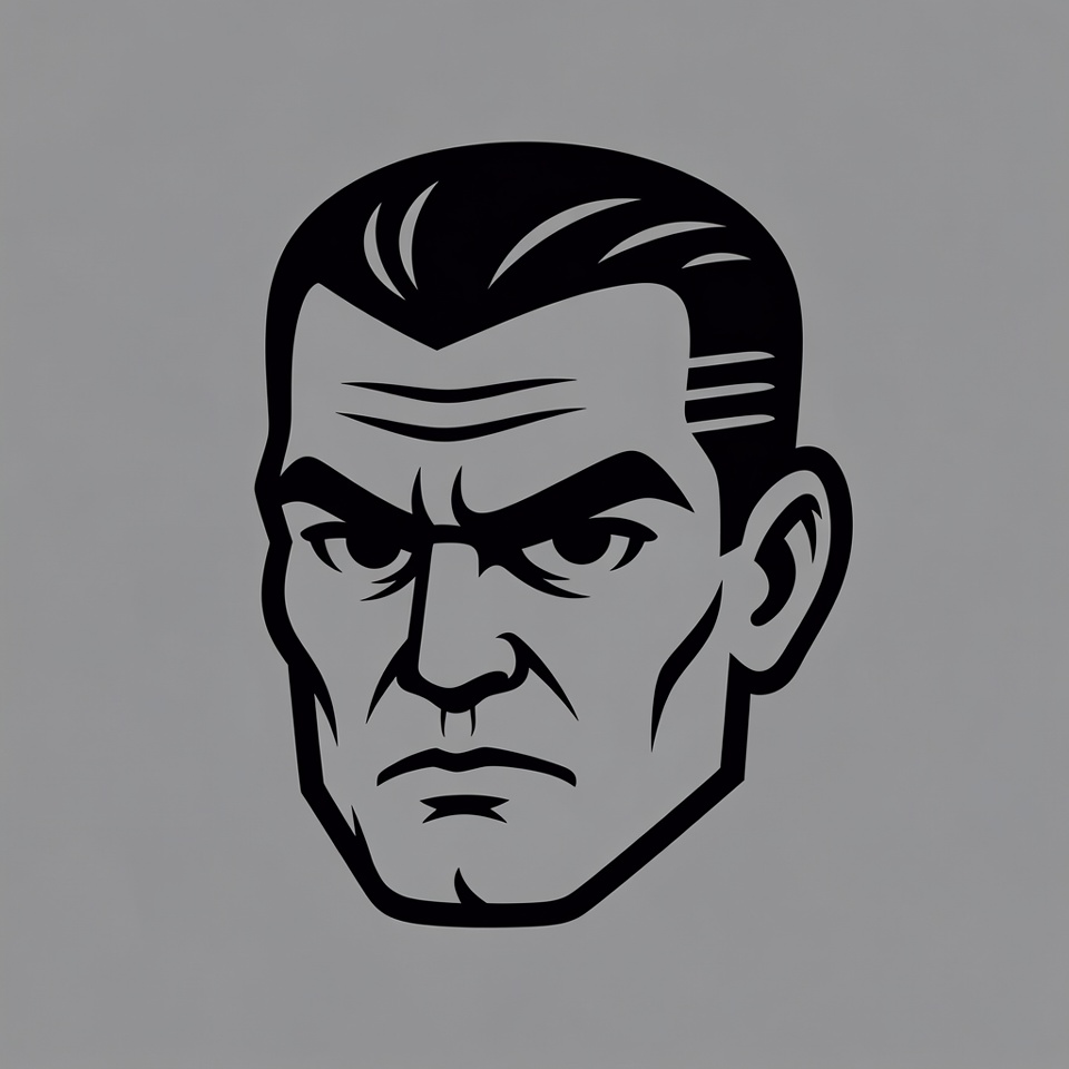 A black silhouette illustration of a man's stern face with a furrowed brow and intense scowl. The bold line art features slicked-back hair and a strong jawline on a gray background. The design is simple and graphic with thick outlines.