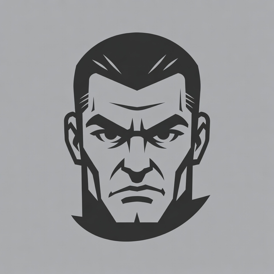 A bold black silhouette illustration of a man's intense face with short hair and a fierce scowl. The design features sharp angular lines and is set against a solid gray background. The expression shows narrowed eyes and a downturned mouth.