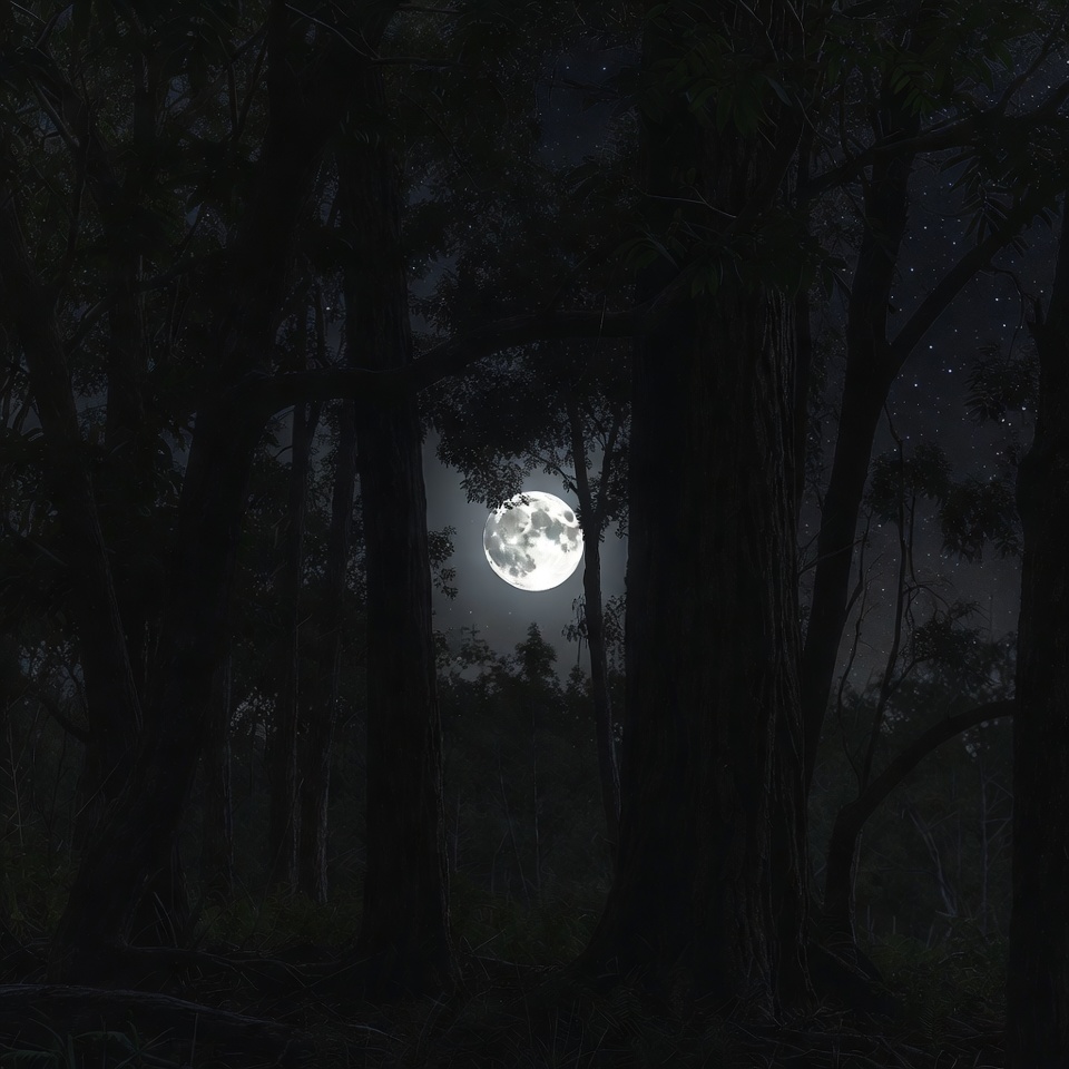 branches, dark forest, dense woods, forest at night, landscape, moon, moonlight, mysterious forest, nature, night sky, nocturnal, silhouetted trees, starry sky, trees, trunks, woods, full moon