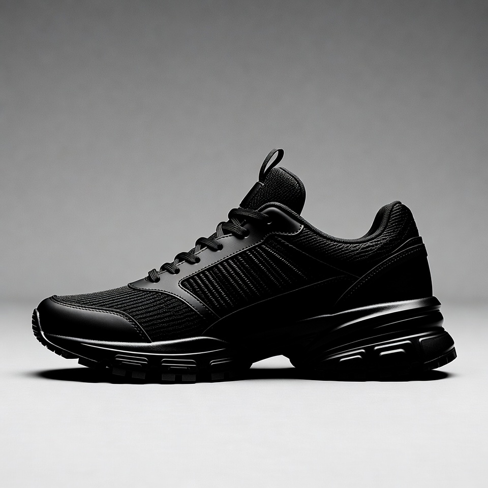 athletic footwear, black shoes, footwear, gray background, gym shoes, isolated background, jogging shoes, laced shoes, mesh upper, modern design, rubber soles, rugged soles, running shoes, side view, sneakers, sporty shoes, stylish sneakers, trainers, tread pattern, black sneakers
