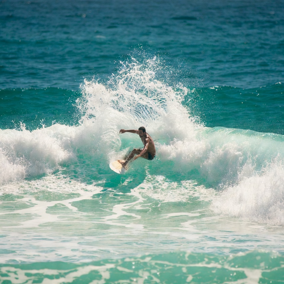 action shot, athletic, balance, beach, board shorts, crashing waves, foam, male, man, ocean, ride, sea, spray, summer, surfboard, surfer, tropical, turquoise water, water sports, wave, white foam, white surfboard, surfing