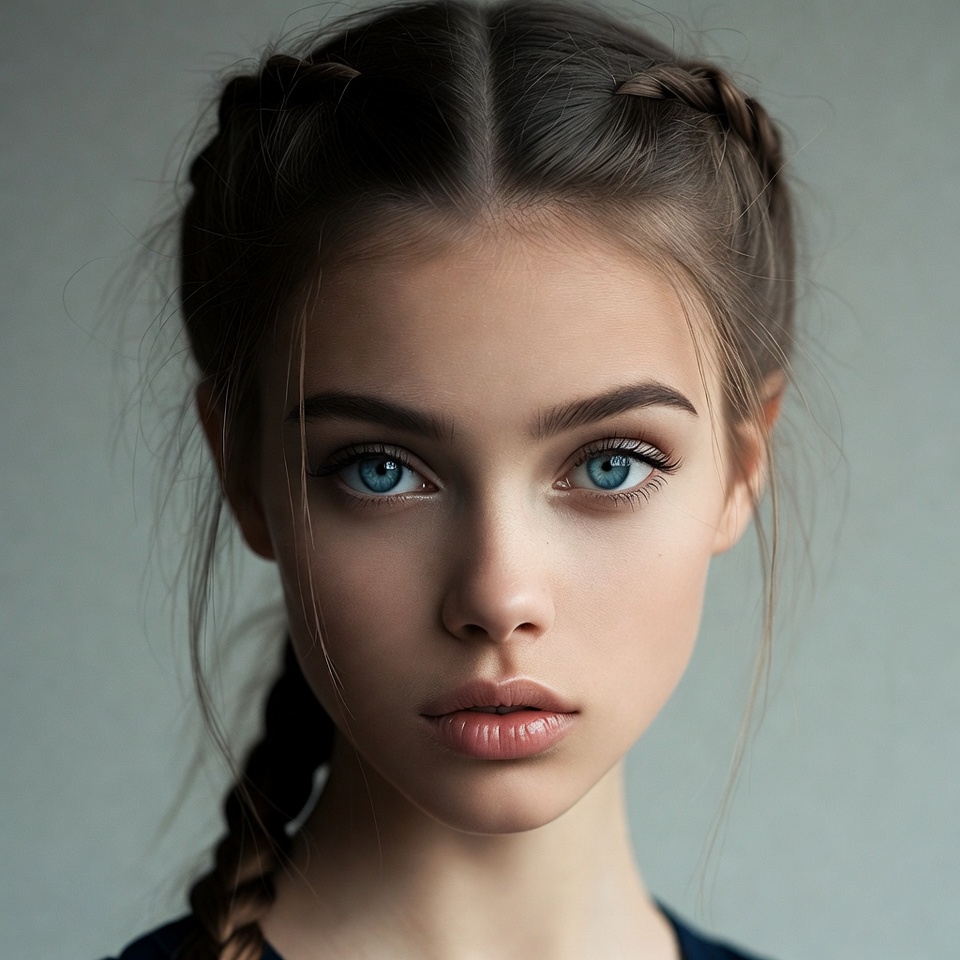 A young woman with long brown hair styled in two braids gazes directly at the viewer. She has striking blue eyes, full lips, and fair skin. The portrait is set against a plain light blue background.