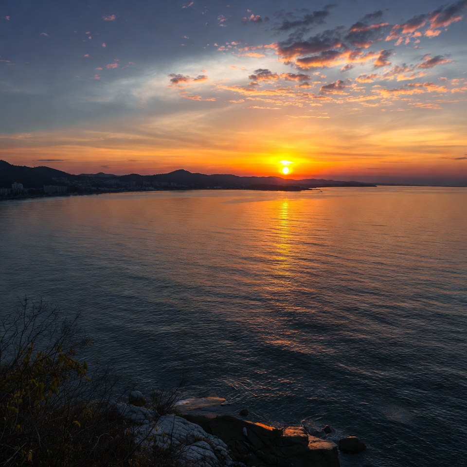 A vibrant sunset illuminates the sky with orange, pink, and purple hues over a calm ocean. Distant mountains and a coastal city silhouette appear on the horizon, with the sun's reflection shimmering on the water. In the foreground, rocks and dry grass frame the seascape view.