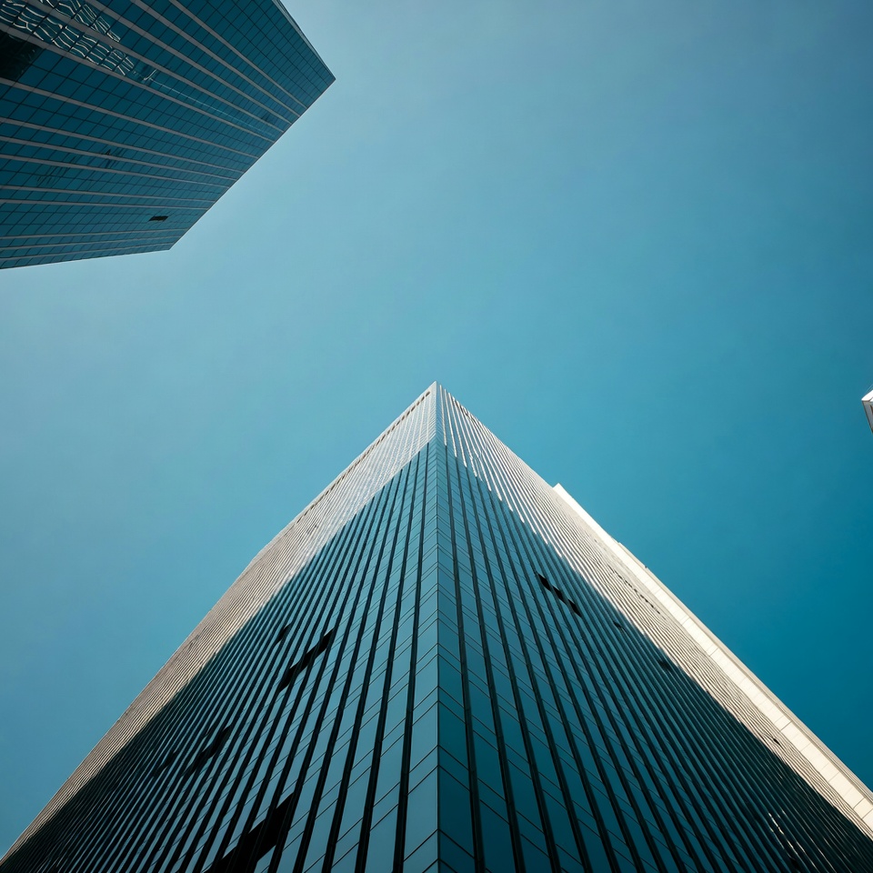 architecture, blue sky, buildings, city, cityscape, clear sky, corporate towers, downtown, glass buildings, glass facade, high-rise, low angle, modern architecture, office buildings, reflections, skyline, tall buildings, urban, vertical lines, skyscrapers