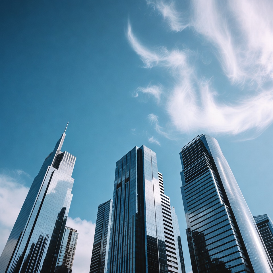 architecture, blue sky, buildings, city skyline, cityscape, clear sky, clouds, downtown, facade, glass buildings, high-rise, metropolis, modern architecture, reflection, spire, tall buildings, urban, white clouds, skyscrapers