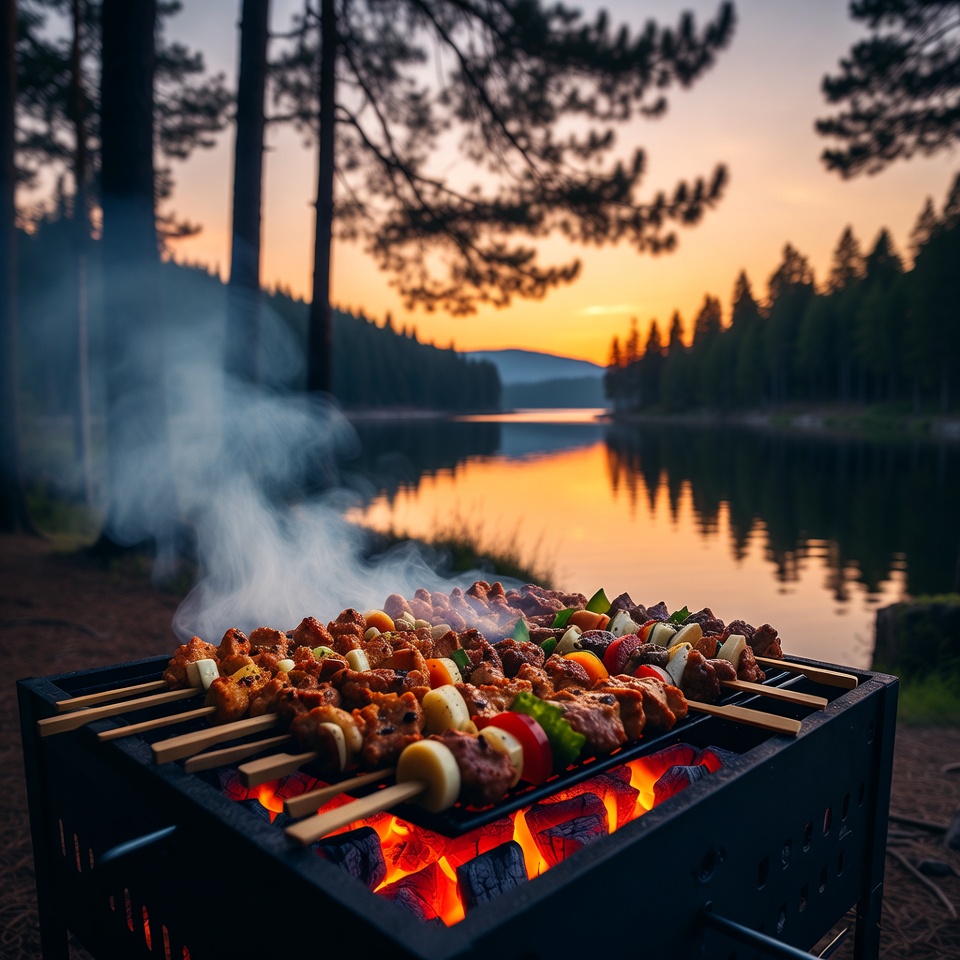 camping, coals, dusk, fire, forest, grass, lake, meat skewers, mushrooms, nature, onions, outdoors, peppers, pine trees, shore, skewers, smoke, sunset, vegetables, water reflection, barbecue grill