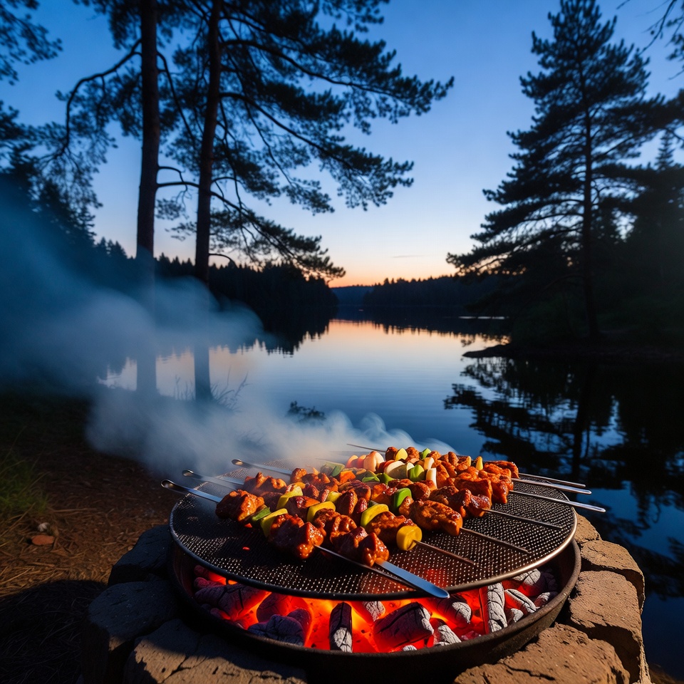 A round barbecue grill with skewers of chicken and peppers cooks over glowing coals, producing rising smoke. Tall pine trees frame the scene, with a calm lake reflecting the colorful sunset sky in the background. The setup is placed on a stone base near the water's edge.