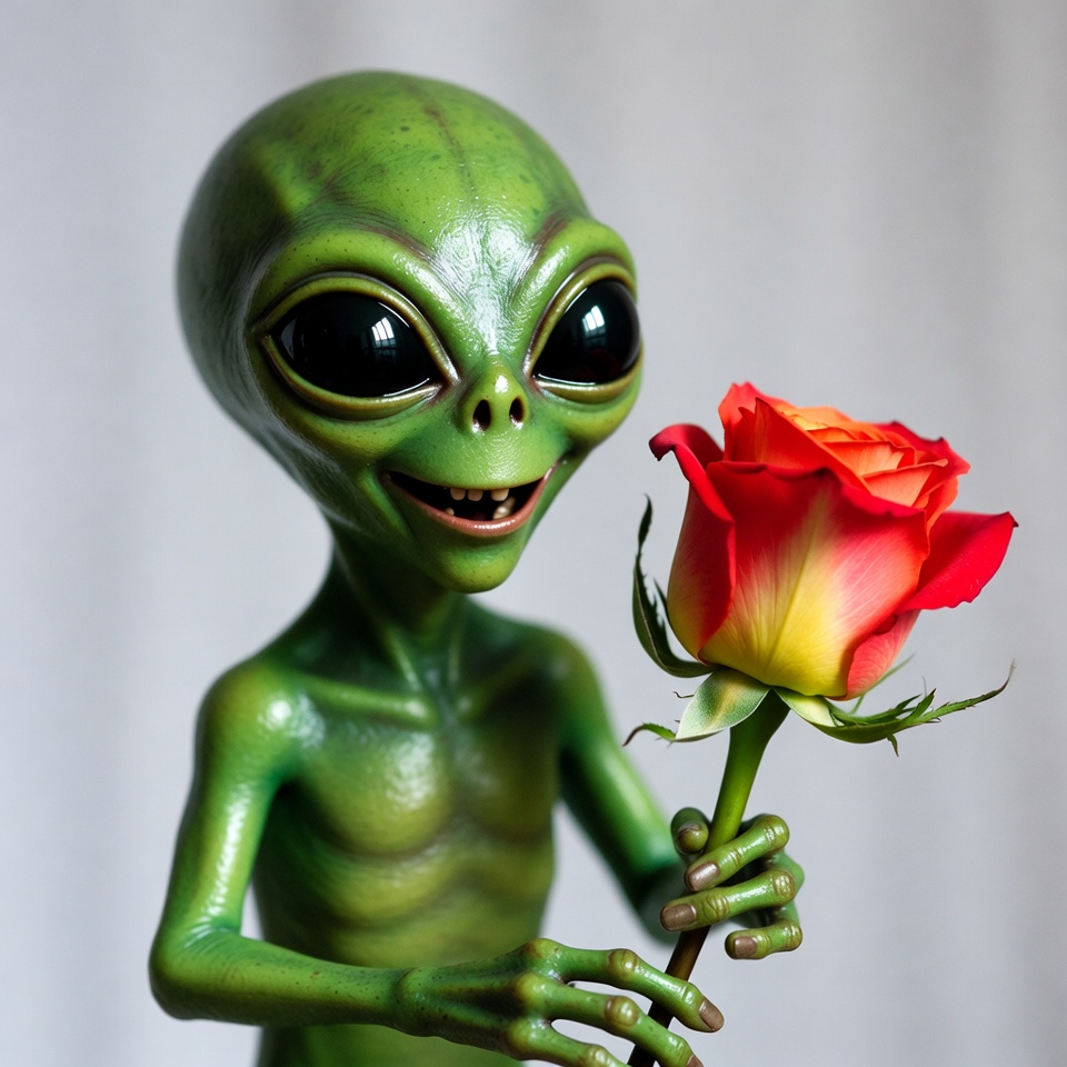 Alien holding red rose