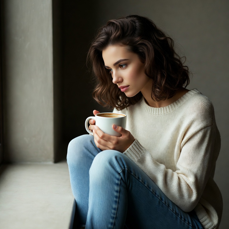 A young woman with long wavy brown hair sits by a large window holding a white mug of coffee. She wears a light beige sweater and blue jeans, gazing thoughtfully to the side. The background features a plain gray wall and concrete floor.