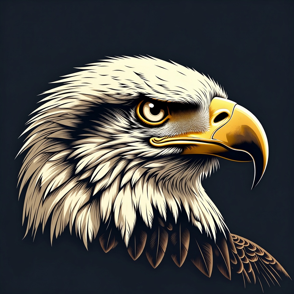 bird, closeup, dark background, digital illustration, eagle head, eagle illustration, eagle portrait, feathers, golden highlights, isolated background, majestic eagle, predatory bird, profile view, raptor, white feathers, wildlife art, yellow beak, yellow eyes, bald eagle
