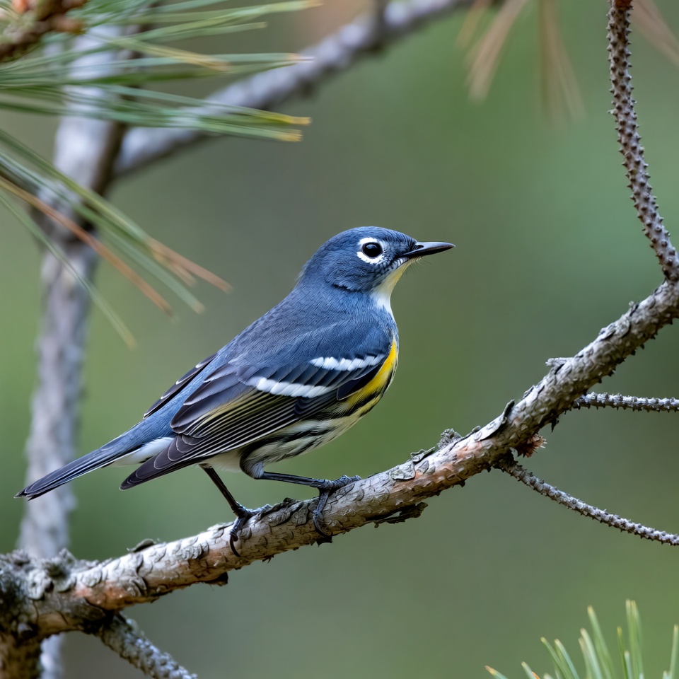 avian, bird, black throat, blue bird, feathers, forest background, nature, perching bird, pine branch, pine needles, small bird, songbird, warbler, white belly, wildlife, yellow wing patch, black-throated blue warbler