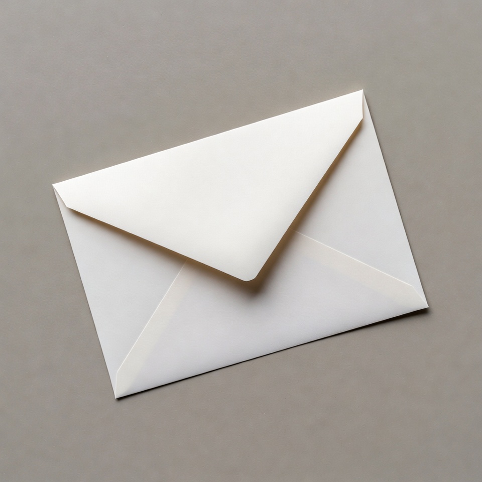 A white envelope with a pointed flap lies flat on a smooth gray surface. The envelope is viewed from above, showing its clean edges and subtle texture. It is isolated against the plain background.