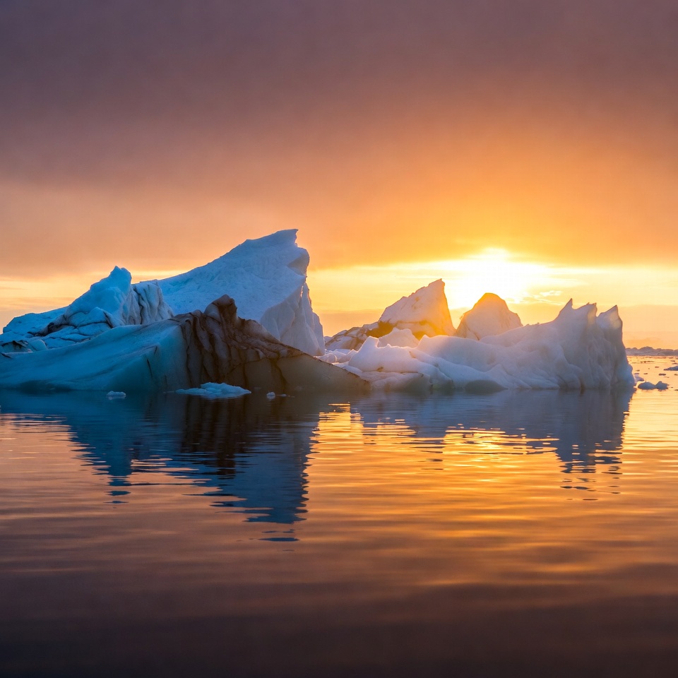 Large icebergs float in calm Arctic waters during sunset. The sun casts an orange glow over the jagged ice formations and their mirror-like reflections on the water surface. Dark purple skies frame the vibrant scene.