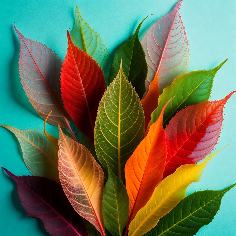 blue background, colorful leaves, fall leaves, foliage, green leaves, isolated background, leaf arrangement, leaf veins, multicolored leaves, nature, orange leaves, pink leaves, red leaves, seasonal leaves, translucent leaves, vibrant colors, yellow leaves, autumn leaves