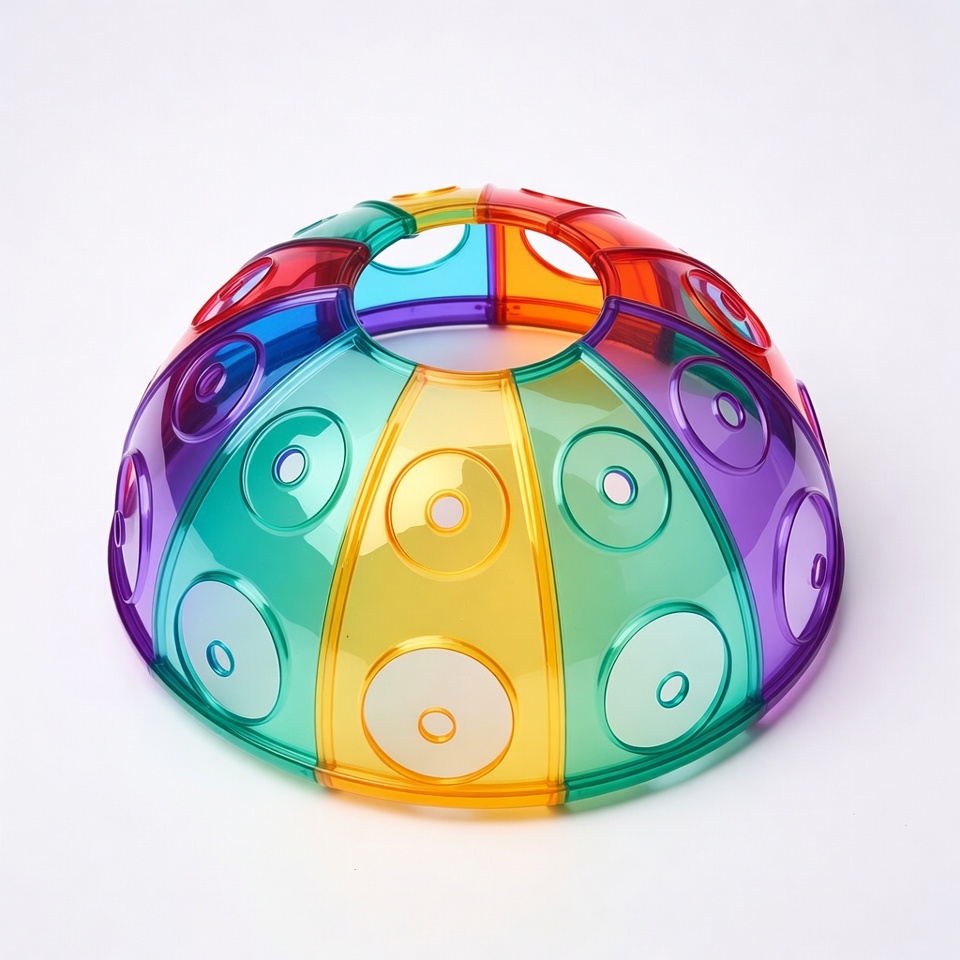 blue section, circular holes, colorful toy, dome object, dome shape, green section, isolated background, kids toy, multicolor plastic, orange section, plastic dome, plaything, purple section, red section, translucent toy, vibrant colors, yellow section, rainbow dome