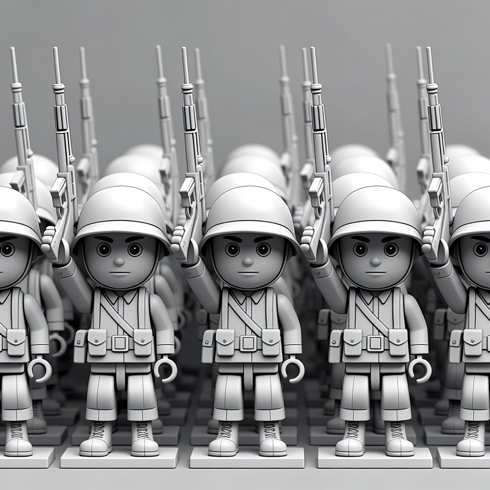 3D render, Lego minifigs, WW2 soldiers, White, army men, boots, chibi soldiers, grayscale, grid formation, helmets, illustration, male, military formation, minifigures, plastic toys, rifles, salute pose, soldiers, standing soldiers, toy soldiers, uniform, war toys, Lego soldiers