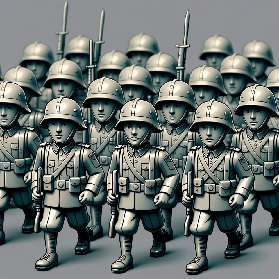 A group of stylized German soldiers in gray uniforms and Stahlhelm helmets marches forward holding rifles with fixed bayonets. They are rendered in a 3D illustration style with a metallic sheen on an isolated gray background. The soldiers stand in formation, facing forward with determined expressions.