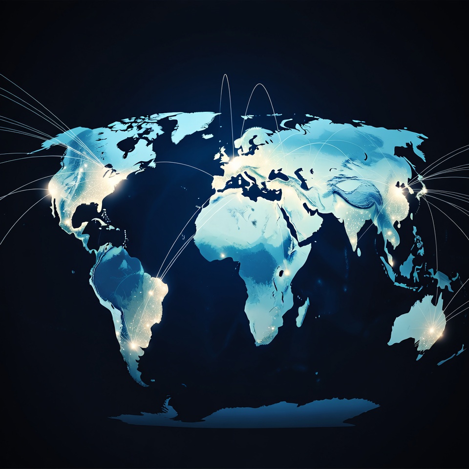 A digital illustration of a glowing blue world map on a black background features bright white highlights on continents. Thin glowing lines radiate from various points across the globe, suggesting global connections. The design emphasizes a futuristic network visualization.