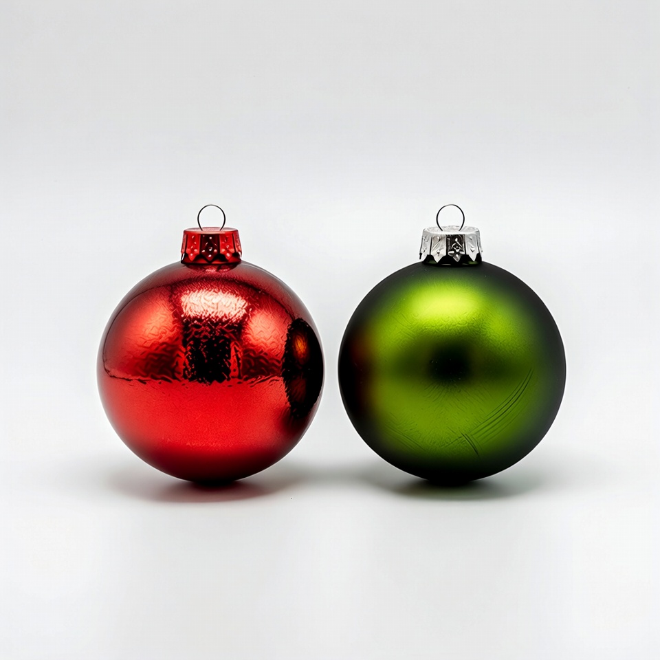 Christmas balls, baubles, festive decor, glossy surface, green bauble, green ornament, holiday decorations, isolated background, metallic finish, red bauble, red ornament, round ornaments, shiny bauble, silver hook, white background, Christmas ornaments