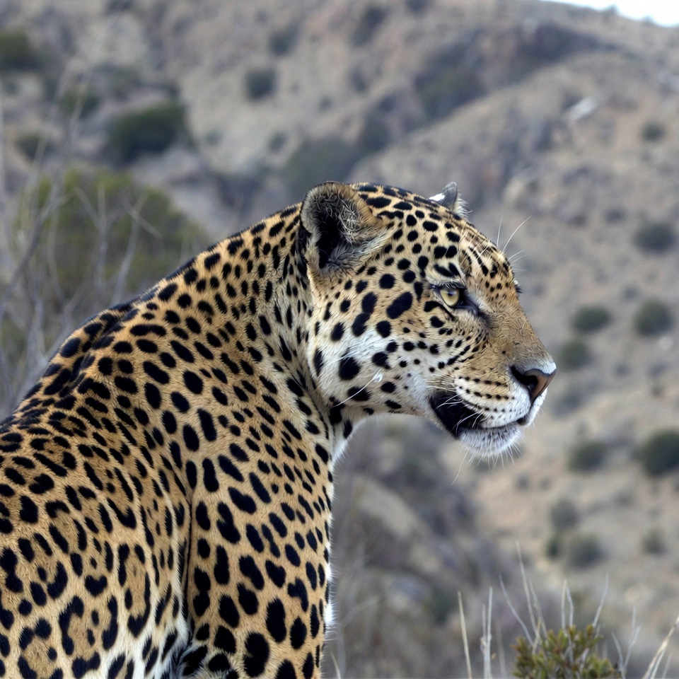 A jaguar with distinctive black rosettes stands in profile on rocky terrain with mountains in the background. Its head is turned slightly, showing yellow eyes and whiskers. Sparse vegetation and distant hills frame the wild cat.