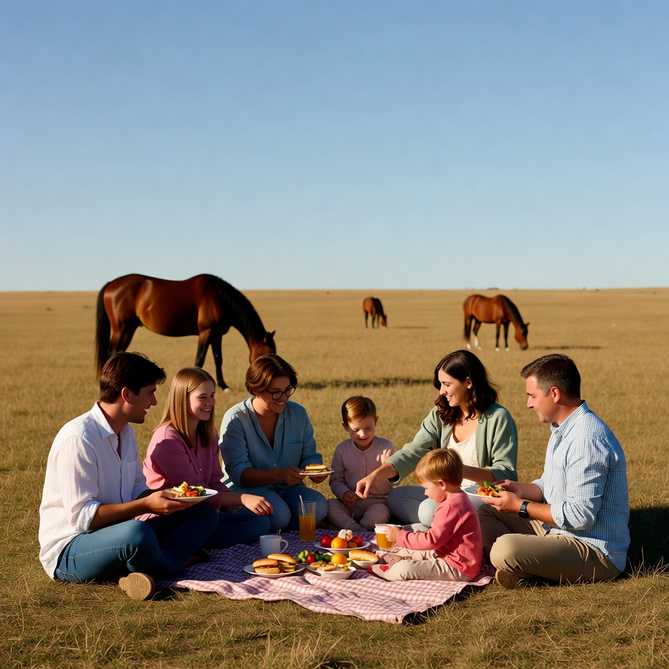 A White family of eight, including parents, children, and toddlers, sits on a checkered picnic blanket enjoying burgers, fruits, and drinks. They are surrounded by open golden grasslands under a clear blue sky. Several brown horses graze in the background field.