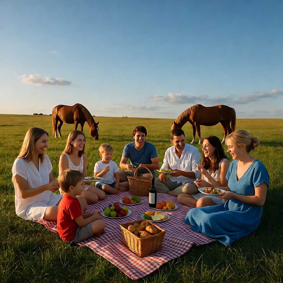 A large White family sits on a red checkered picnic blanket in a green field, enjoying fruits, cheese, bread, and wine from a wicker basket. Adults and young children smile and eat together under a blue sky with scattered clouds. Two brown horses stand nearby in the grassy meadow during golden hour light.