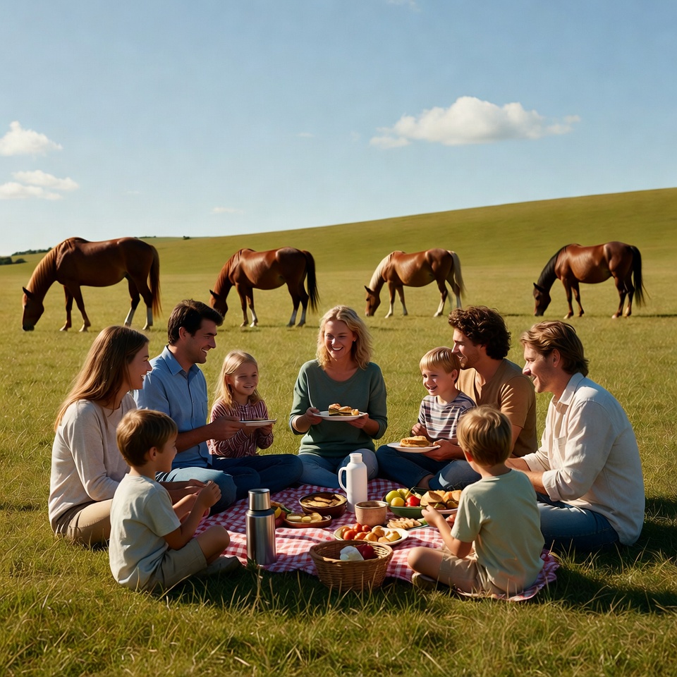 A large White family sits on a checkered blanket in a green field enjoying a picnic with sandwiches, fruits, and a thermos. They include adults and children smiling and eating together. Horses graze in the background under a blue sky with clouds.