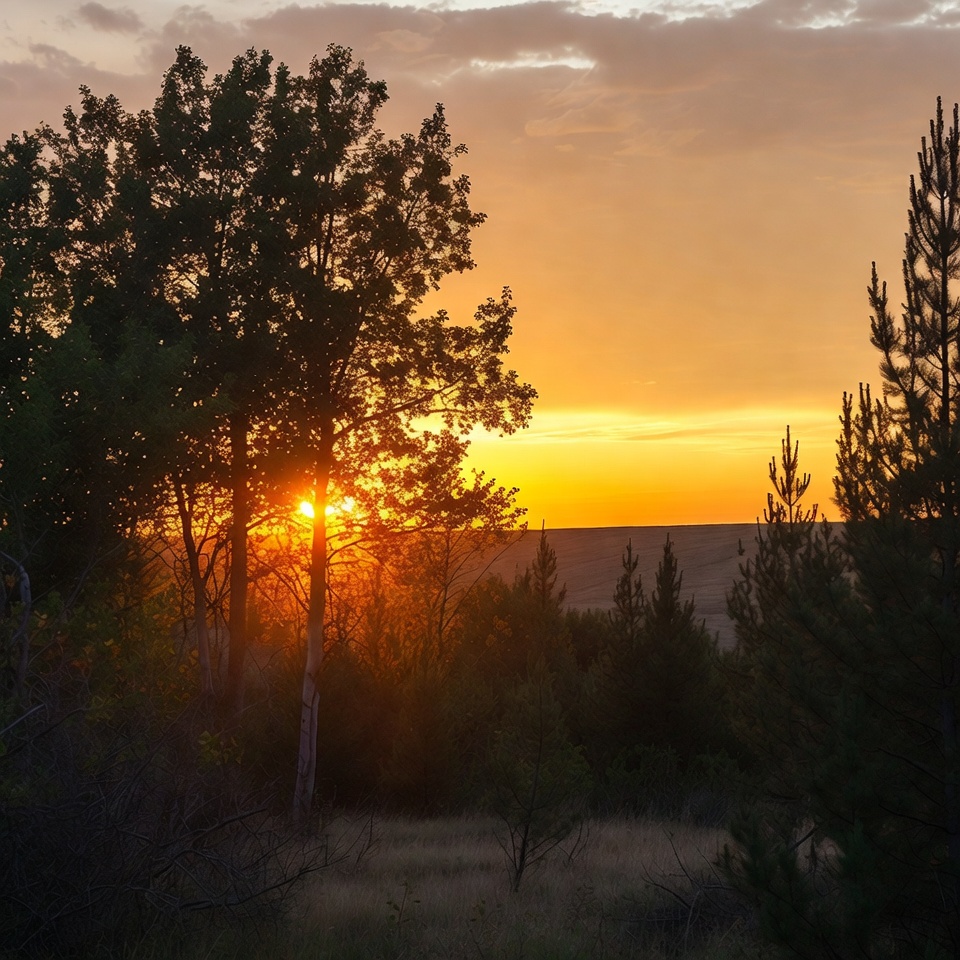 A vibrant sunset illuminates a landscape with silhouetted trees, including tall pines and leafy deciduous trees. The sun hangs low on the horizon, casting golden light through the branches. A grassy field stretches in the foreground with scattered bushes.