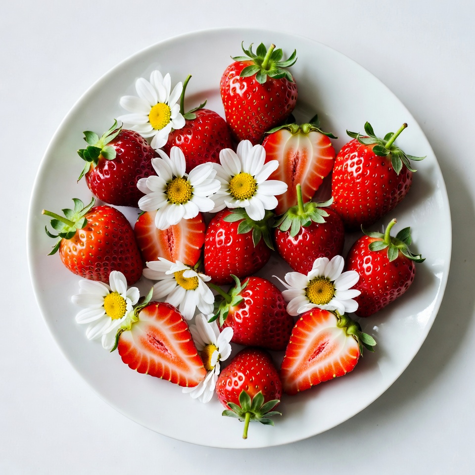 Strawberries and Daisies on White Plate