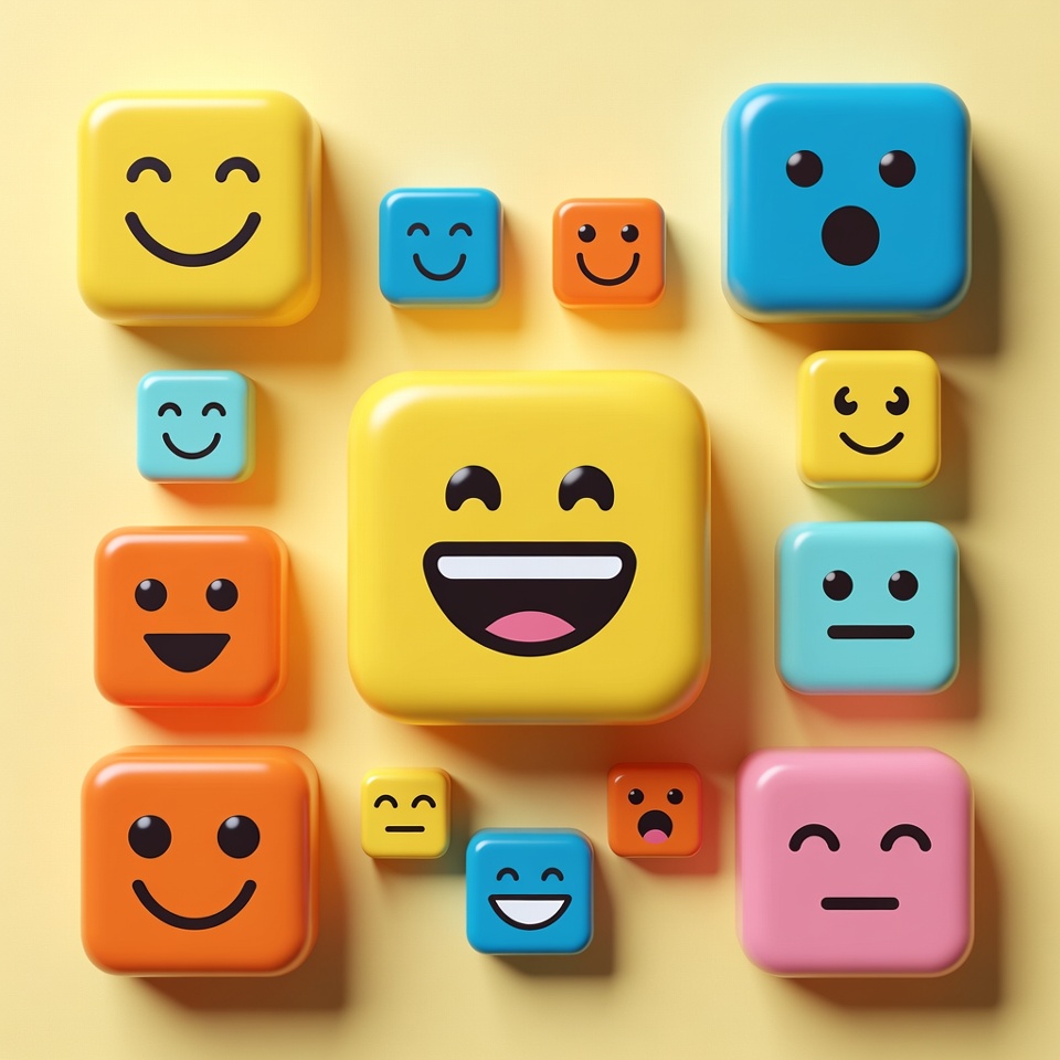 3D cubes, blue cubes, clipart, colorful cubes, cube toys, emoji cubes, fun faces, happy faces, illustration, isolated background, orange cubes, pink cubes, smiling emojis, teal cubes, yellow background, yellow cubes, smiley faces