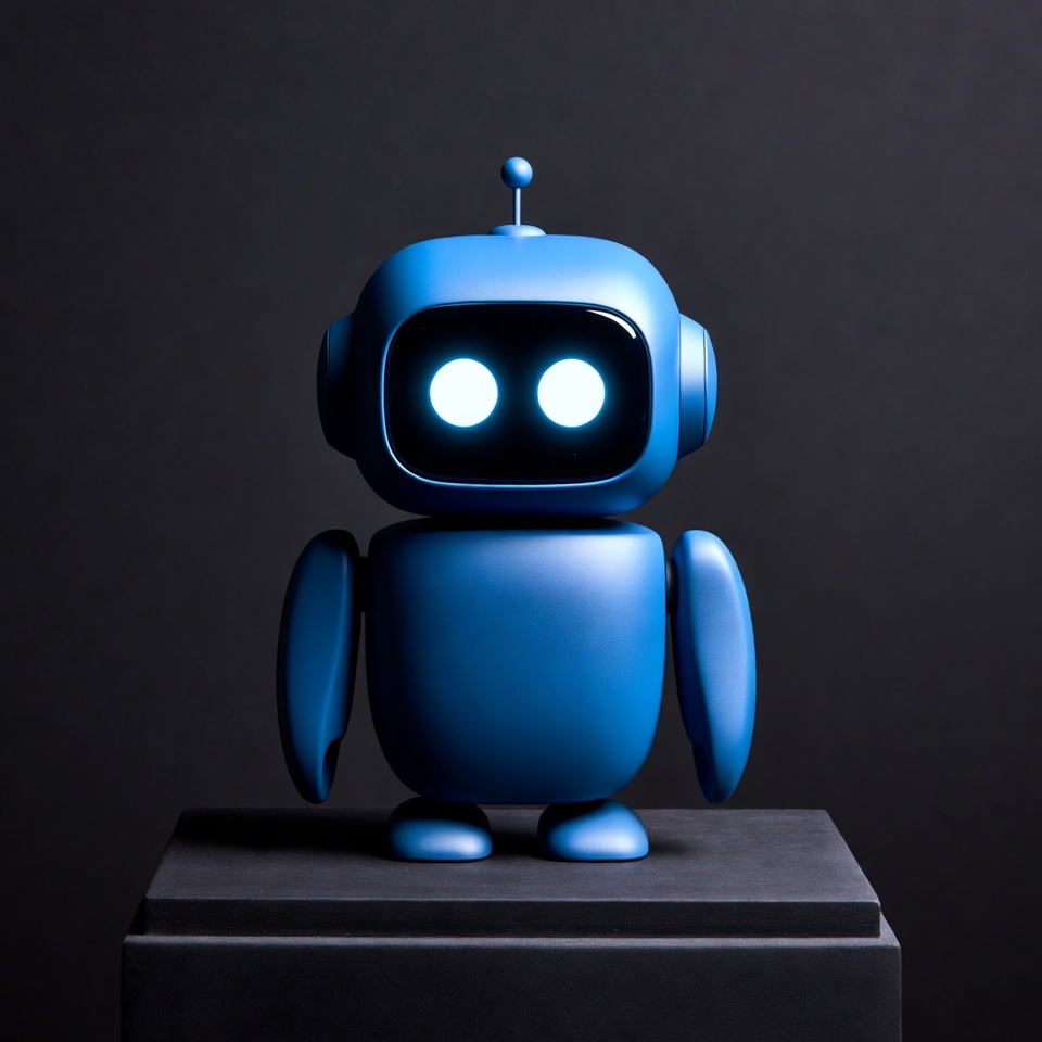A cute blue robot with glowing white eyes stands on a black platform against a dark background. The robot has a rounded body, antenna on top, and articulated arms and legs. It features a smooth, glossy plastic appearance.