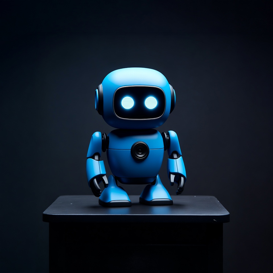 black background, cute robot, dark background, futuristic robot, glowing eyes, isolated background, mechanical robot, robot, robot figure, sci-fi robot, small robot, standing robot, toy robot, blue robot