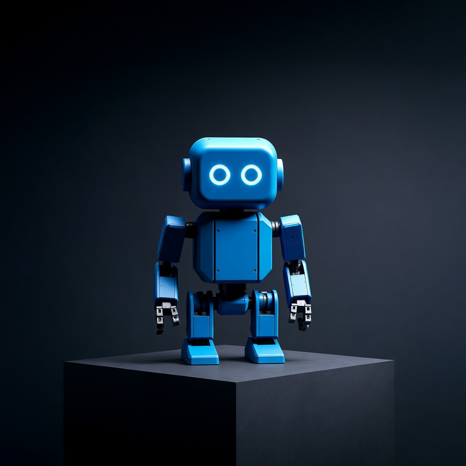 A cute blue 3D rendered robot with glowing white eyes stands on a black platform. It has a boxy body, jointed arms and legs, and a glossy surface against a dark background. The robot faces forward in a neutral pose.