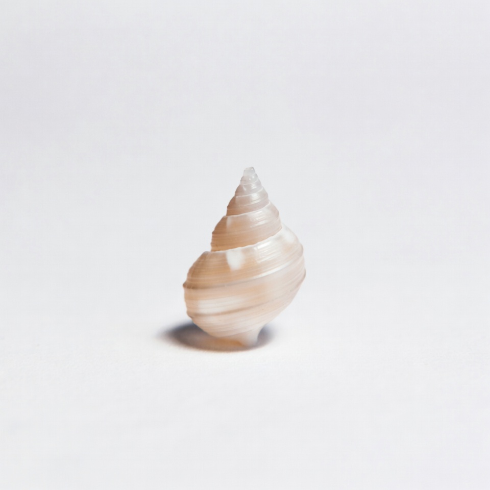 A translucent white seashell with a spiral shape sits on a plain white background. The shell features smooth, layered coils and a pointed tip. Subtle shadows highlight its texture and form.
