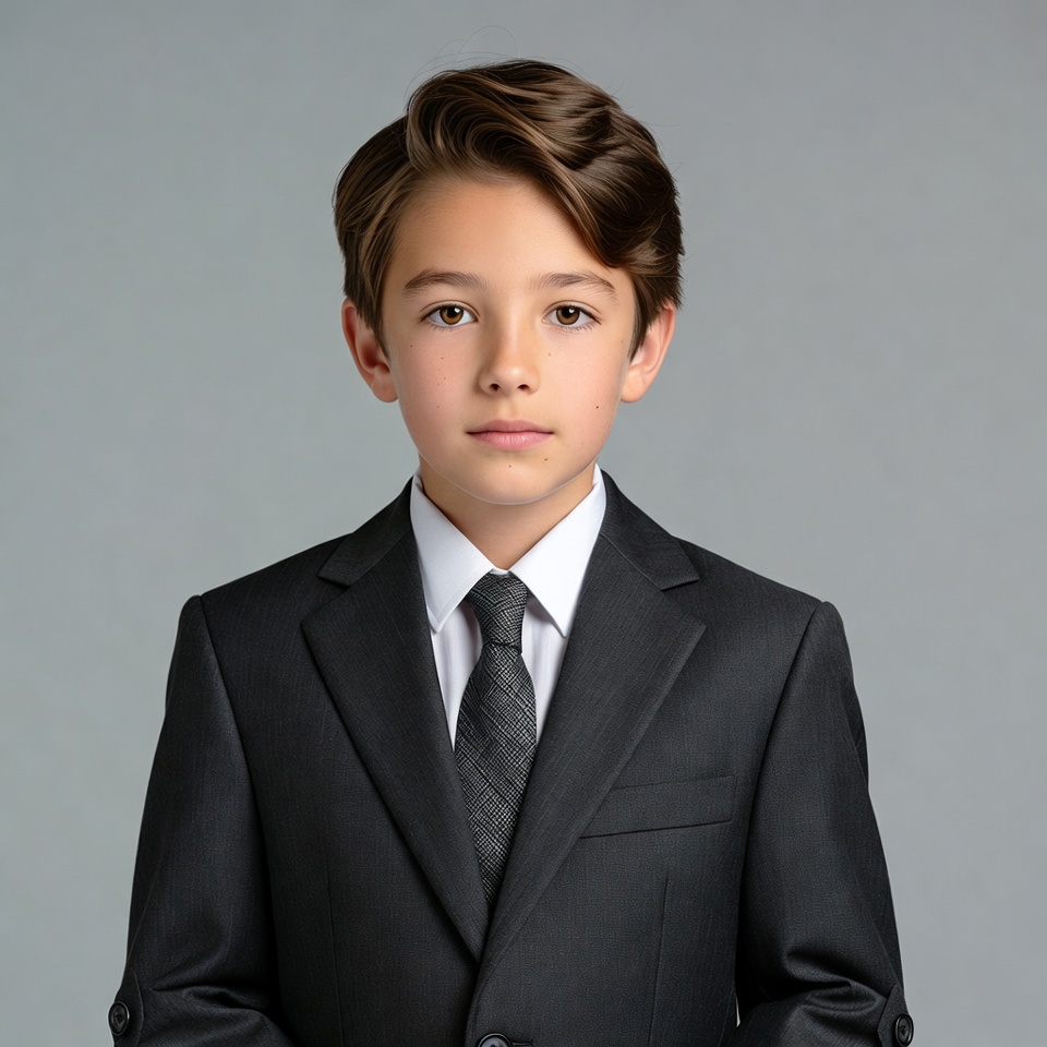 A young boy with neatly styled brown hair stands against a gray background. He wears a dark gray suit, white dress shirt, and patterned tie. His expression is neutral with hands clasped in front.