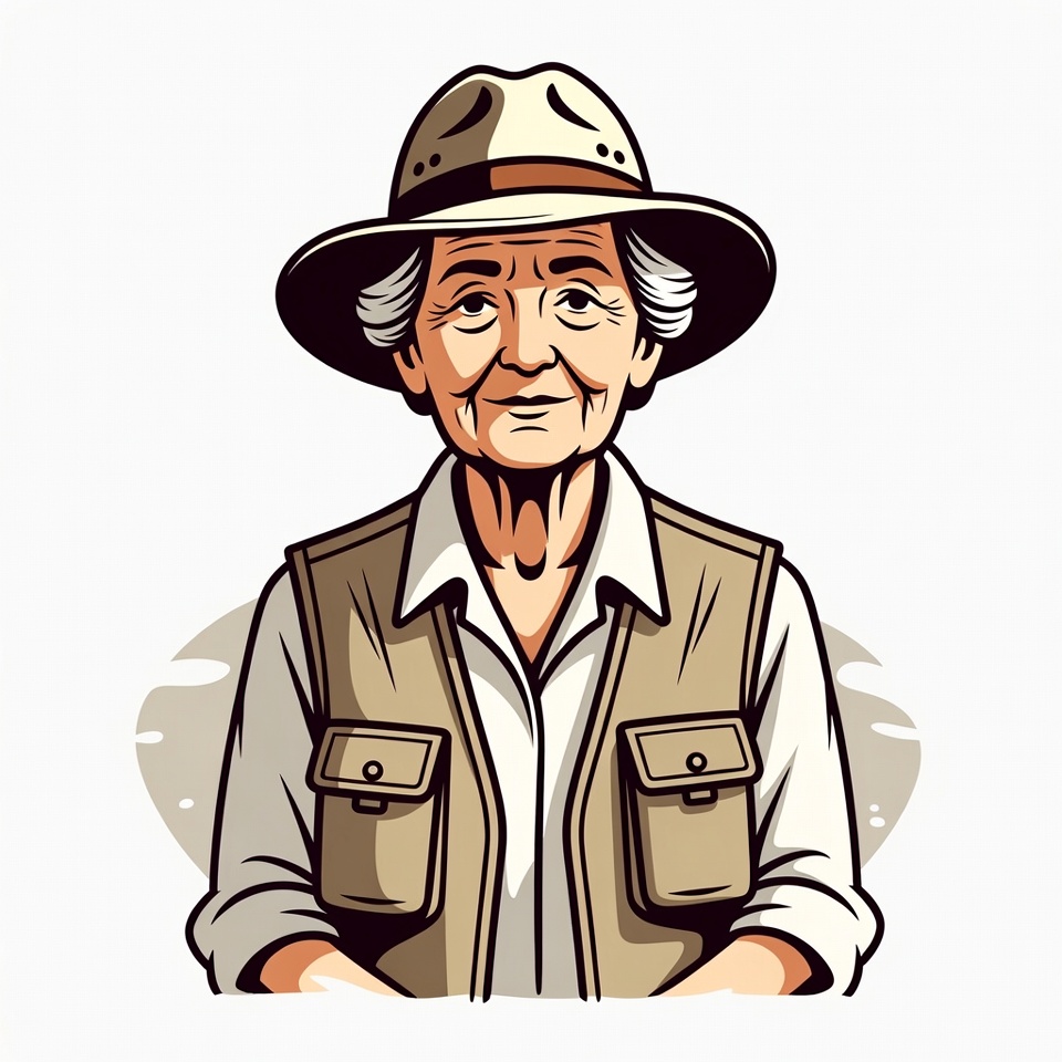 An illustration of an elderly White woman with white hair wearing a wide-brimmed safari hat and khaki vest over a white collared shirt. She has a gentle expression and is depicted from the waist up against a light isolated background. Her hands are visible at her sides in a relaxed pose.