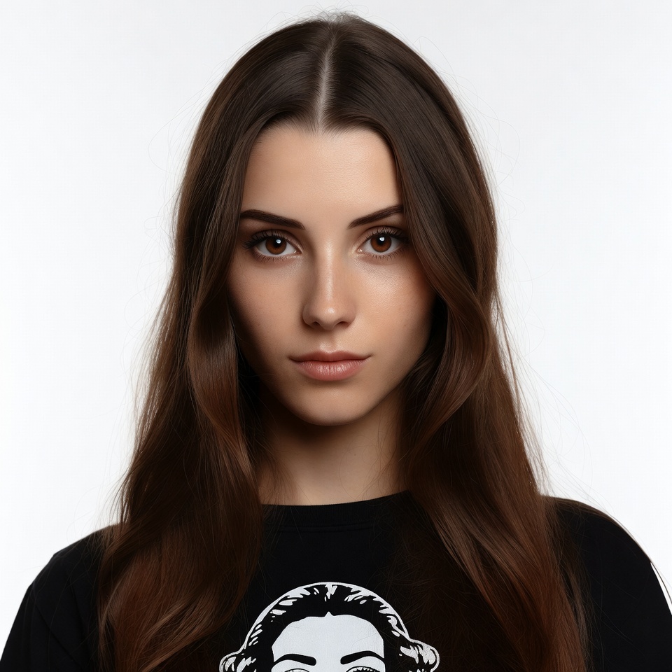 A young woman with long straight brown hair faces the camera directly on a white background. She wears a black shirt featuring a white portrait print of a woman's face with curly hair. Her expression is neutral with subtle makeup.
