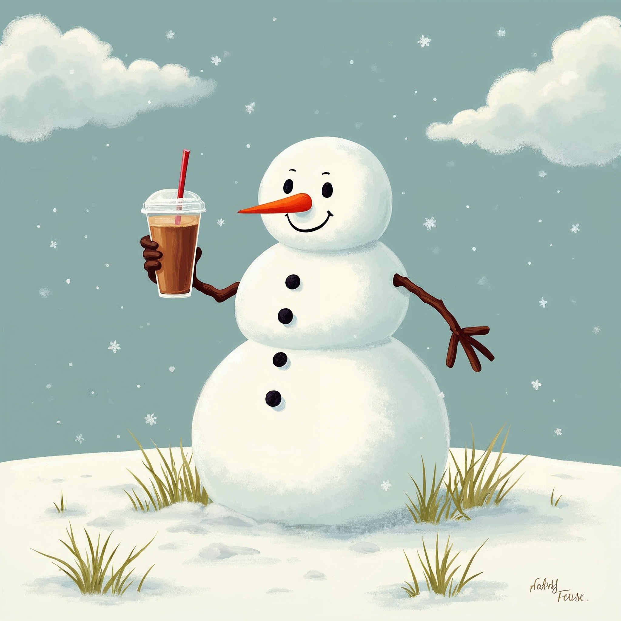 A cheerful cartoon snowman with a carrot nose, black eyes, and buttons stands on snowy grass. It holds a large iced coffee in a clear cup with a red straw in its brown glove. Fluffy clouds and light snowflakes fill the light blue sky behind it.
