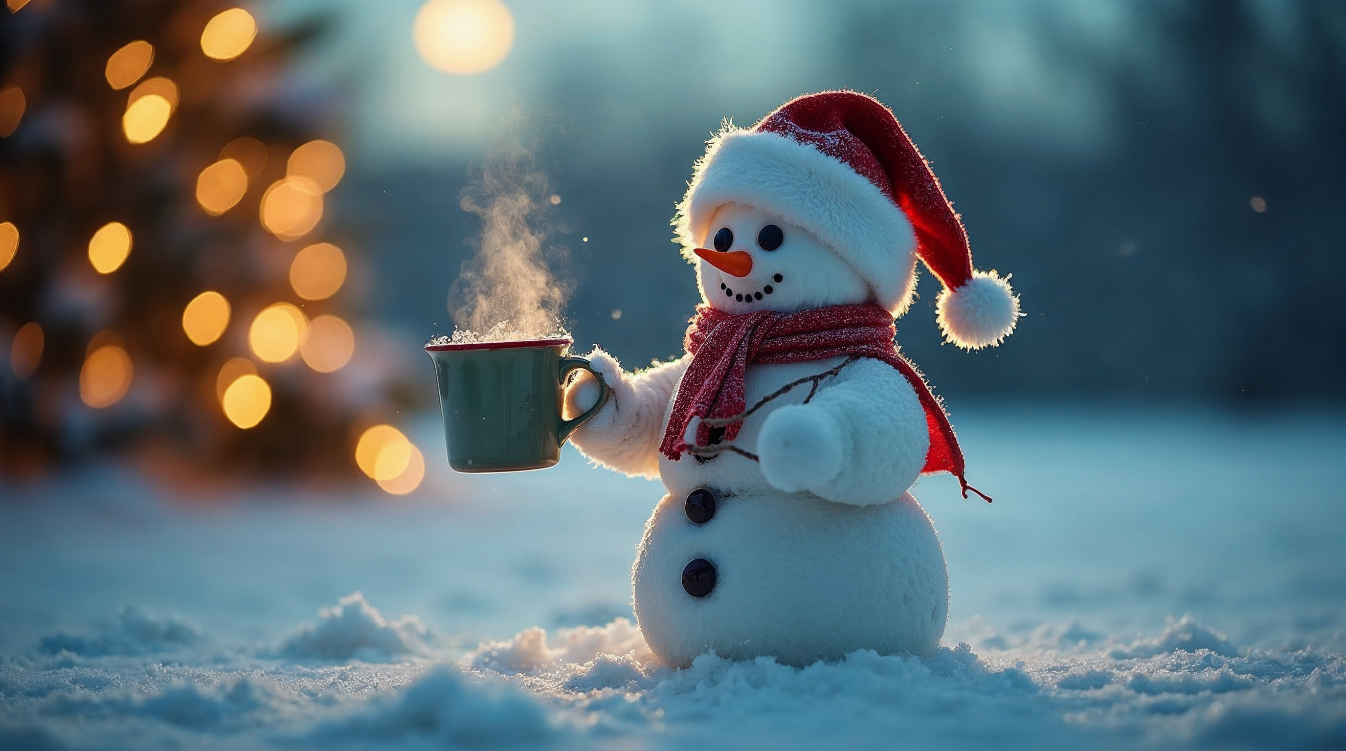 A cheerful snowman with a red scarf and Santa hat stands in the snow holding a green mug with steam rising from it. A decorated Christmas tree with colorful lights glows in the blurred background under a twilight sky. The snowman has a classic carrot nose, coal eyes, and buttons on a snowy landscape.