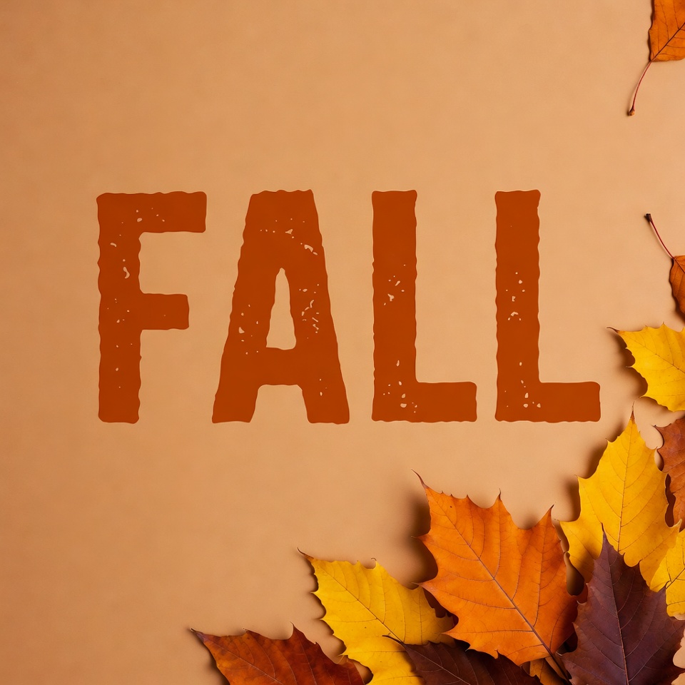 Bold orange 'FALL' text is centered on a beige background. Scattered yellow and orange autumn leaves surround the text on the bottom right. A few fallen leaves float in the upper corners.