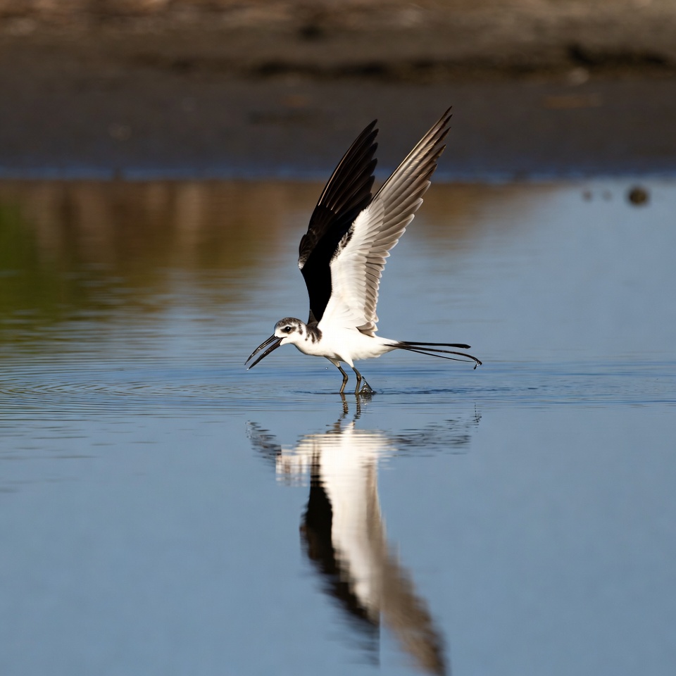 avian, bird, black wings, flying, isolated background, long bill, nature, pink legs, reflection, shallow water, shore, shorebird, stilt, wading bird, water, white plumage, wildlife, wings, black-winged stilt